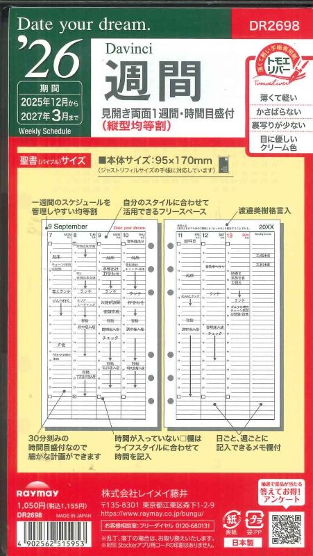 【メール便OK】レイメイ藤井 2026 Date your dream 週間リフィル バイブルサイズ DR2698
