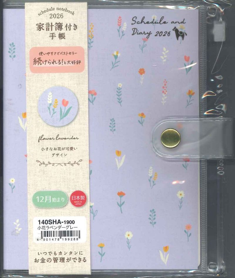 【メール便OK】クツワ 2026手帳 家計簿 付き 手帳 A6 小花ラベンダーグレー 140SHA