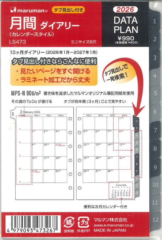 【メール便OK】マルマン 2026 月間ダイアリー ミニサイズリフィル6穴 LS473 [10016003]